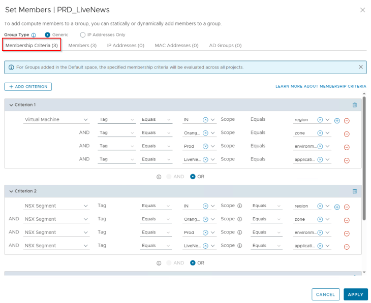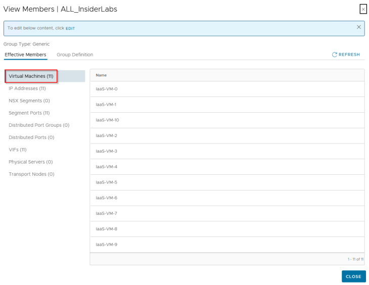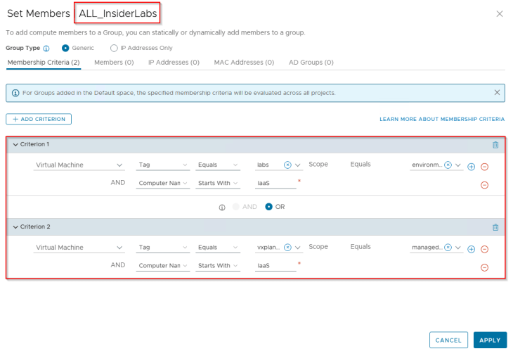 A security group for the Labs environment is created in NSX (called ALL_InsiderLabs) with a dynamic membership criteria based on tags and Computer Name. VMs are assigned with few tags, one tag being “Scope: environment and Tag: labs”. This specific tag is applied purposefully to discuss tag conflicts and resolution while we do the import to SSP.