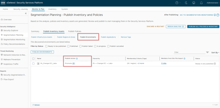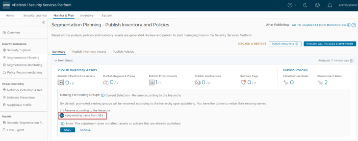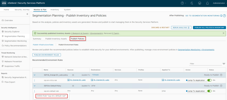 Since we are promoting NSX group as an Environment asset, we won’t have any infrastructure or application policies to publish. Let’s publish the intra-environment policy for the Labs environment. Note that this rule has an action of “Jump to Application” which can’t be modified from SSP. The environment category default rule was already created in the previous chapter, hence we can delete the same from the recommendation.