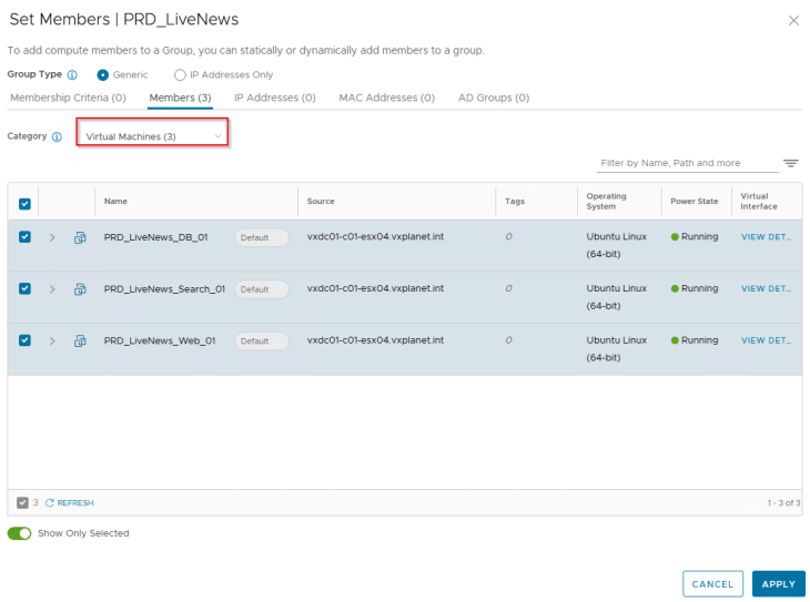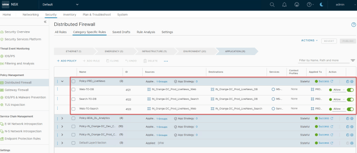We have pre-created a security group for this application called “PRD_LiveNews” in NSX manager with a static membership. Security groups for the tiers are not created, and will be done by SSP as part of csv import.