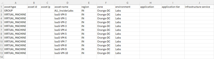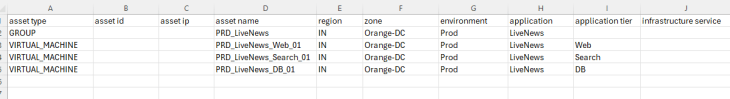 Since the objective is to onboard the NSX group as an environment asset in SSP, we will create a new csv file with a partial hierarchy information, including only the region, zone and environment fields and skipping the application and application tier fields. It is important to include the NSX group along with all the VMs that are expected to be a part of the group, so that SSP can assign the hierarchical tags and match the VMs to the group membership based on the dynamic tag based criteria.