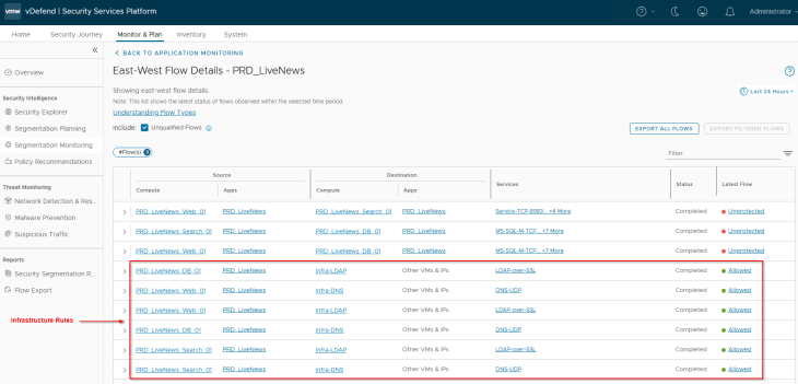 Let’s review the flows for the LiveNews application. We see that flows to shared infrastructure services are allowed as we already had the necessary infrastructure policies in place.