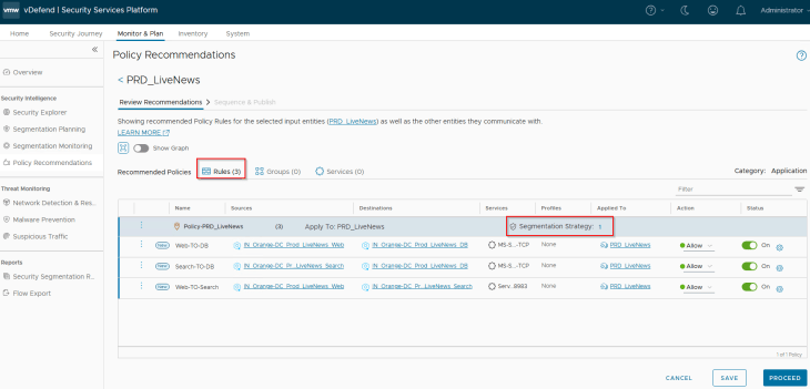 We will now run a recommendation and include a segmentation strategy with a default Deny rule (as we are confident about the expected flows of the application)