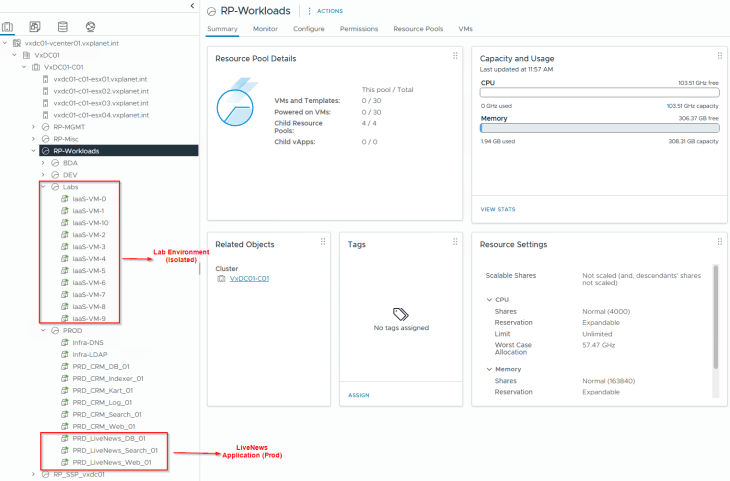 To demonstrate this use case, I have deployed a new environment called “ALL_InsiderLabs” under a new vCenter resource pool called “Labs” alongside Prod, Dev and BDA environments. This Labs environment currently has 10 IaaS lab VMs (subject to scale) and will be completely isolated from the rest of the environments. Microsegmentation is out of scope for this environment, and our objective is limited to environment separation (or zone segmentation).