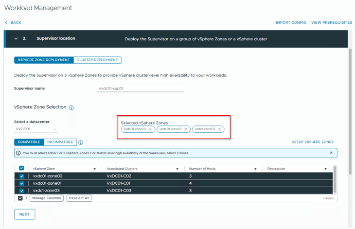 • This architecture has three vSphere clusters each mapped as a vSphere zone. Each vSphere zone is a failure domain. Maximum of three zones are currently supported, and all the three zones / vSphere clusters become one supervisor.