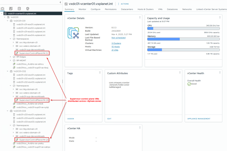 • Supervisor control plane VMs and TKG service cluster VMs (control plane and worker-node-pools) are distributed across the vSphere zones for high availability.