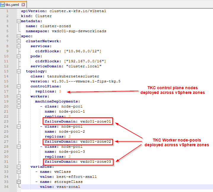 • TKG service cluster worker nodes can be deployed across vSphere zones by defining a “failureDomain” for each node pool. Each “failureDomain”  maps to a vSphere Zone, and hence each node-pool will be deployed to a specific vSphere  zone, as shown in the below spec: