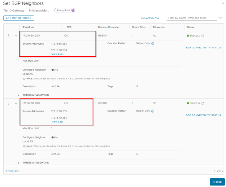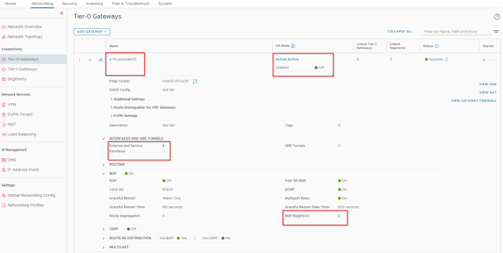 This T0 gateway establishes BGP peering with the TOR switches over its four external interfaces – two via edge node 1 and two via edge node 2.