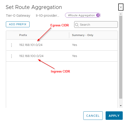 For the Ingress and Egress CIDR that will be used for the vSphere supervisor and namespaces, we have configured route aggregation at the T0 gateway to allow only the summary addresses to be advertised northbound (and not the /32 host routes).
