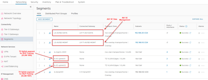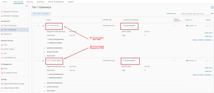 We have two segments created – one for AVI management traffic and the other for AVI System DNS traffic, each attached to their respective T1 gateways, discussed above.