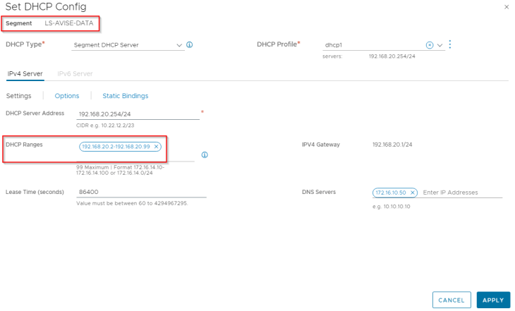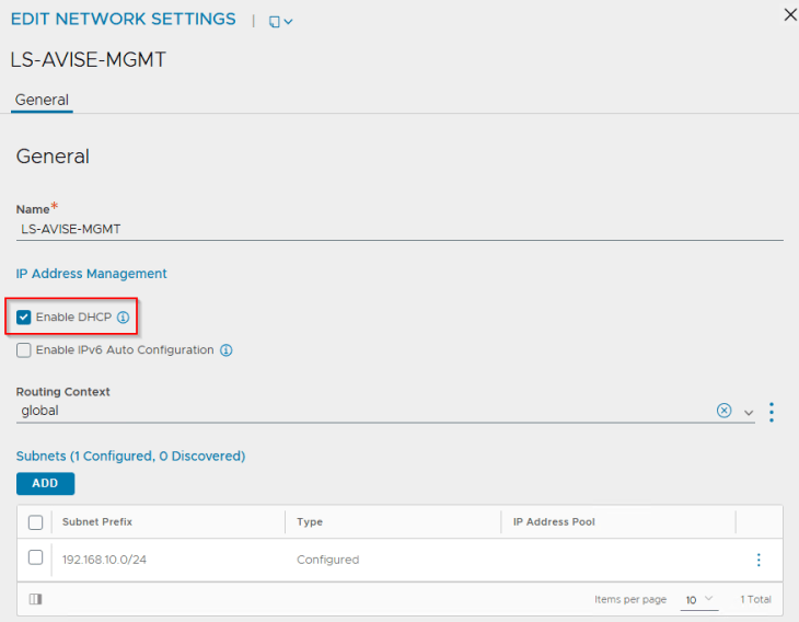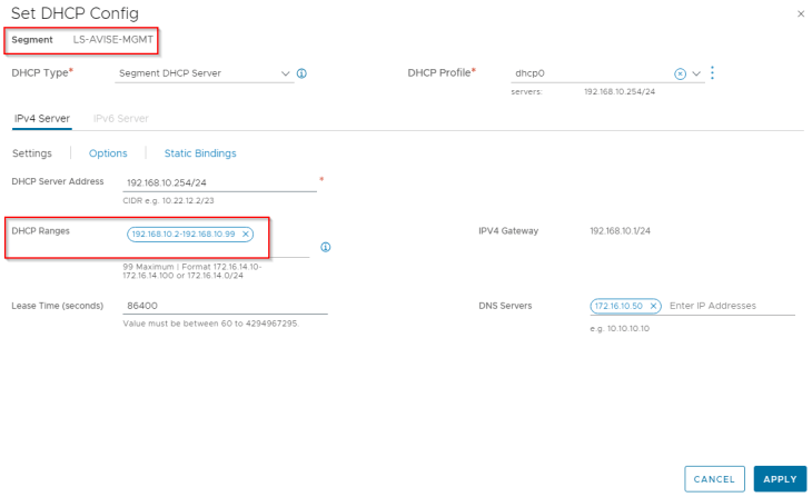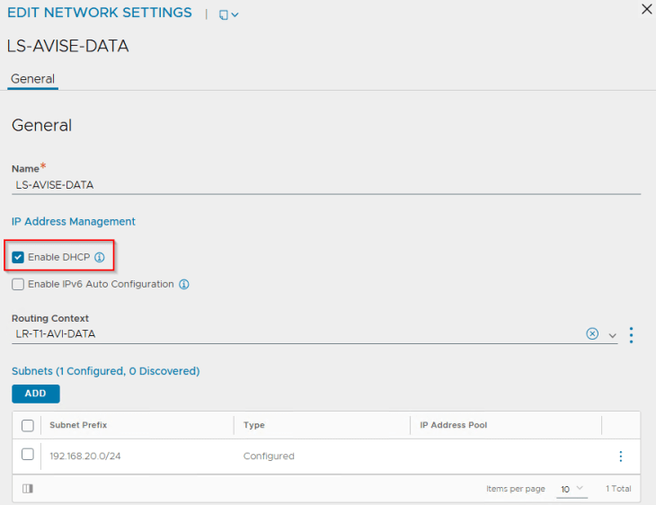Both segments have DHCP enabled to automate the IP addressing for AVI service engines.