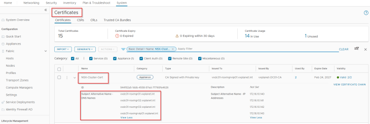 And finally, the NSX cluster certificate is replaced with an internal CA signed certificate. This is optional but is done as it’s a recommended practice.