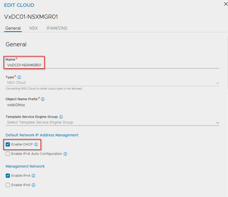 There will be only one management network definition per NSX cloud connector, and all SEs deployed under this cloud connector will inherit the same management settings. In our case, this will be the AVI management T1 gateway and segment that we configured previously in NSX.