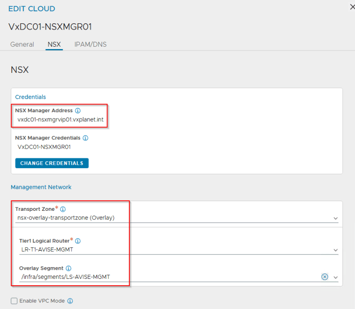 vSphere supervisor with NSX and AVI integration supports only the NSX cloud connector. We have an NSX cloud connector configured on the same NSX overlay transport zone that the vSphere cluster is configured on.