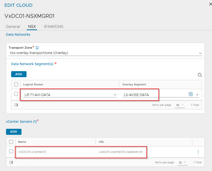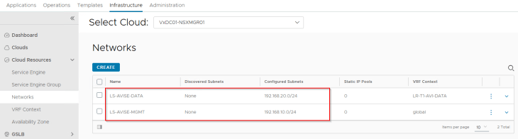 We define the AVI data networks where the SEs will attach to. For each supervisor / namespace T1 gateway that is created, the workflow will dynamically update the cloud connector with the respective data networks. For now, we will add the AVI System DNS T1 gateway and segment to the cloud connector.