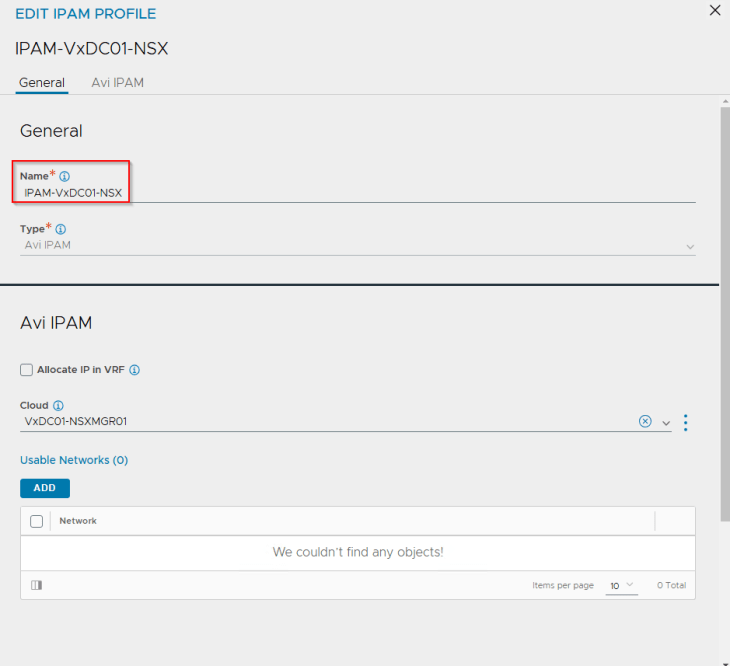 The IPAM profile is just a placeholder at this moment and is kept blank without any networks added to it. This IPAM profile will be dynamically updated with the network information (Ingress subnets) as part of vSphere supervisor and namespace activation workflows.
