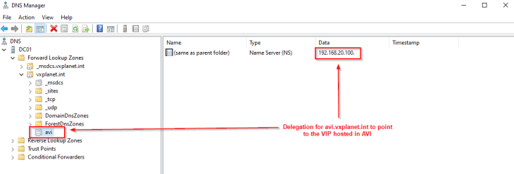 In our environment, we have an AD integrated parent DNS zone ‘vxplanet.int’ where the clients point to. We define a delegation for ‘avi.vxplanet.int’ from the parent zone to the DNS virtual service hosted in AVI, so that DNS requests from any clients tying to access the ingress services on subdomain ‘avi.vxplanet.int’ will be forwarded to the DNS virtual service in AVI. In this way, we can avoid manual DNS host record creation for ingress FQDNs every time they are created.
