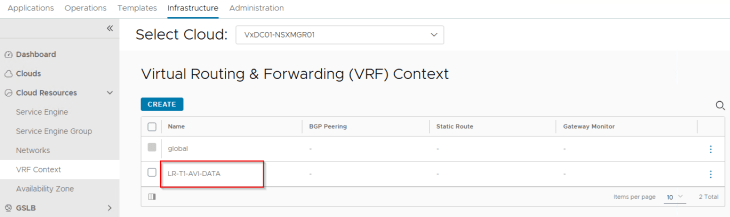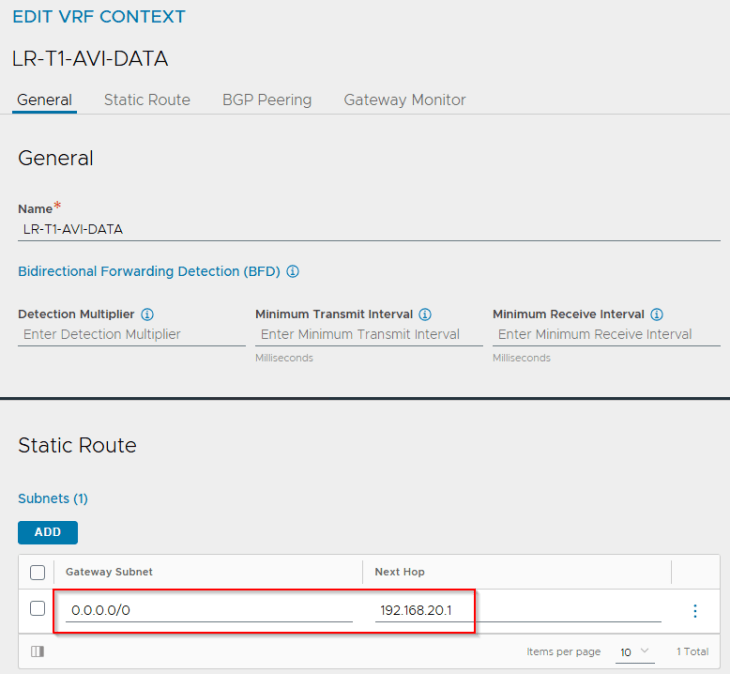 Each T1 gateway that is added as a data network to the NSX cloud connector will be mapped as a VRF context in AVI. If DHCP is not used, a static default route (default gateway) needs to be created for the VRF context.