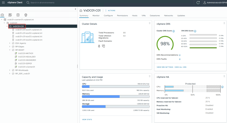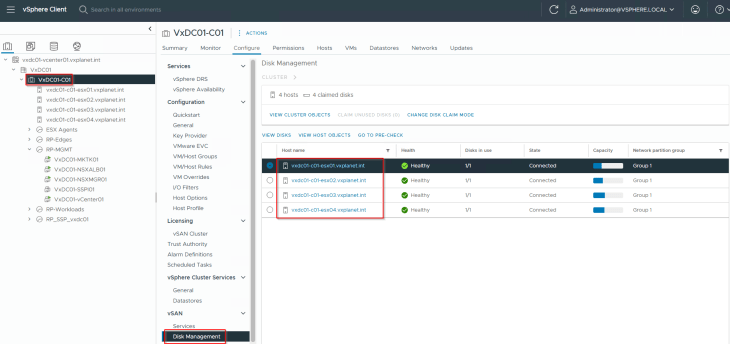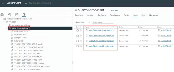 The vSphere cluster ‘VxDC01-C01 ‘ has 4 ESXi hosts, each with 2-pnic networking managed by a single VDS. All the pre-requisite networking including the necessary vCenter port groups are created.
