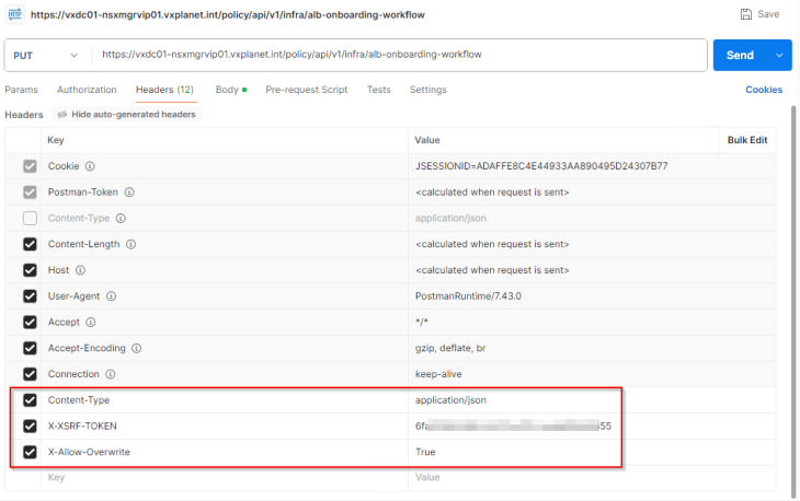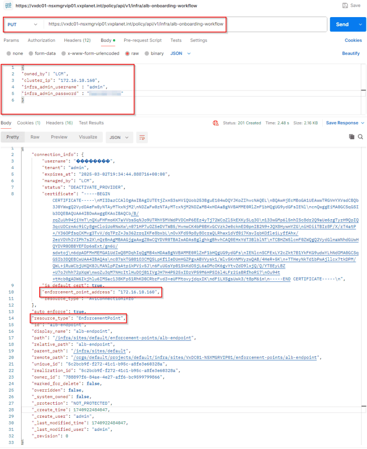 AVI onboarding to NSX is done via API, and this process will set AVI as the enforcement point in NSX so that NSX will use AVI as the LB instead of native-LB. This will be a PUT operation against the ‘/api/v1/infra/alb-onboarding-workflow’ endpoint with the below json body, let’s use Postman to do this: