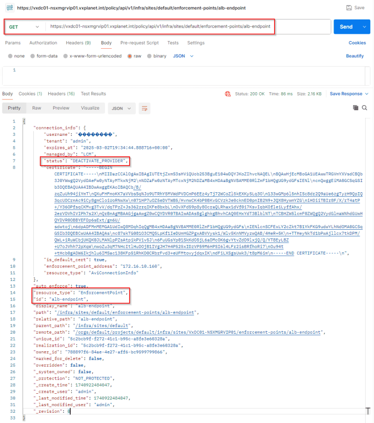 To confirm that AVI has been successfully added as an enforcement point in NSX, let’s perform a GET request to the ‘/api/v1/infra/sites/default/enforcement-points/alb-endpoint’ endpoint.
