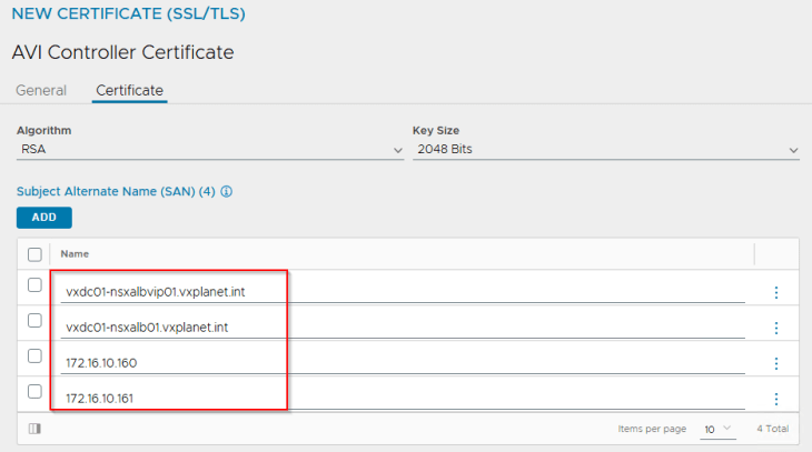 The default AVI portal certificate is self-signed without a SAN field, which cannot be used for vSphere supervisor integration. We will replace this with an internal CA signed certificate.