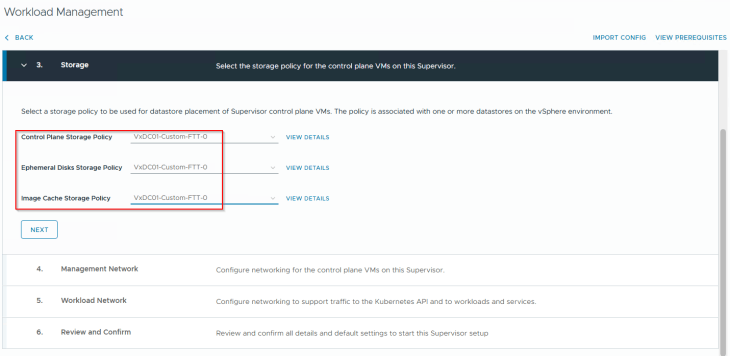We will choose the custom vSAN storage policy that we created in Part 2 for the supervisor control plane VMs, ephemeral disks and image disks.