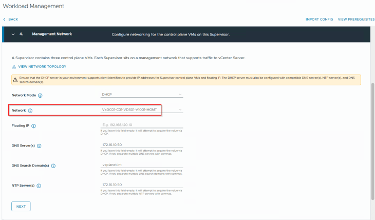 Each supervisor control plane VM is dual-nic’ed with one nic attaching to vCenter DVPG on the management port group (VxDC01-C01-VDS01-V1001-MGMT) and the other nic on the overlay NSX workload segment. Since we have DHCP enabled on the management VLAN, we will choose DHCP as the network mode for the supervisor control plane VMs.