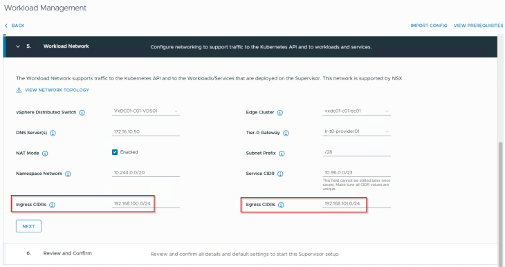 We will choose the default namespace network 10.244.0.0/20 for the vSphere supervisor. The field for ‘Subnet Prefix’ defines how the workload and TKG service cluster networks will be carved out from the namespace CIDR. A value of /28 means blocks of /28 networks will be used for the workload networks (but we can override this with a custom value under the vSphere namespaces).