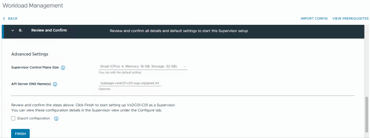 We will go with a small footprint for the supervisor control plane VMs (as our objective is for the blog article). Optionally, we could specify a DNS name for the kube API VIP. Clicking on Finish will start the vSphere supervisor activation and convert the vSphere cluster to a vSphere supervisor cluster.