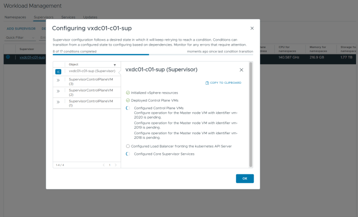 - Workload network : This is where the supervisor control plane VMs attach to. This network is carved out from the namespace network specified in the workflow.