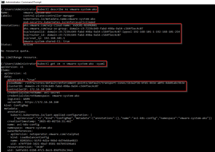 If we review the ‘vmware-system-ako’ system namespace, we should see annotations with the details of AVI cloud connector, AVI SE Group, SNAT IP Pool and the T1 gateway of supervisor. The AKO config map should also show the details of the AVI controller cluster and the cloud connector. This shows that the vSphere supervisor has been initialized properly with AVI (and not native NSX LB) as the load balancer.