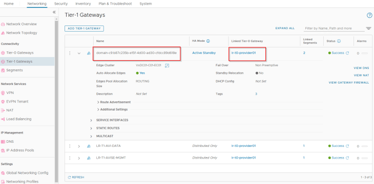 As discussed in Part 1 – Architecture and Topologies, a dedicated T1 gateway is created for the vSphere supervisor up streamed to the provider T0 gateway.