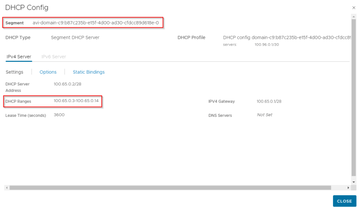 - AVI data segment : This is where the AVI data interfaces hosting the control plane VIPs attach to. This is a non-routable subnet on the CGNAT range and has DHCP enabled.
