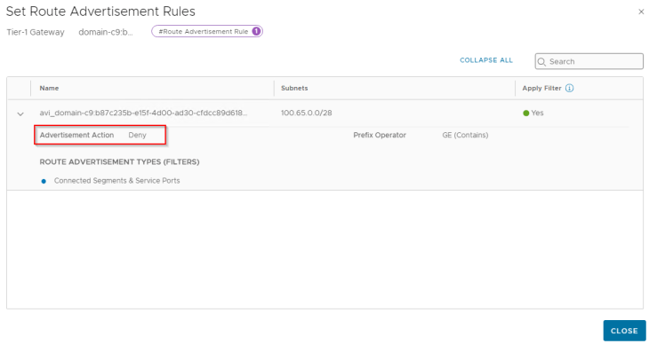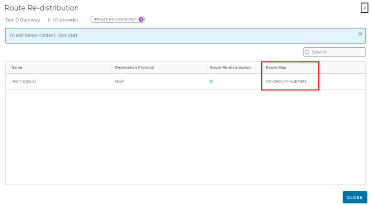 Since we enabled NAT mode for the workload network, a route-map is added to BGP route-redistribution policy to prevent namespace networks from getting advertised to upstream physical fabrics.
