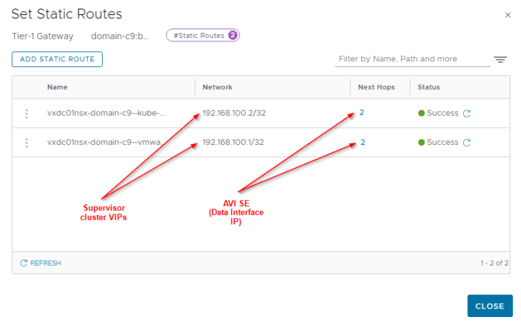 For each VIP created in AVI, a static route is programmed under the T1 gateway with next hop pointing to the data interface of AVI service engines.