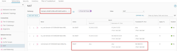 We also have an SNAT rule under the T1 gateway for outbound communication. Note that east-west communication between supervisor and vSphere namespaces will always happen with No-SNAT.