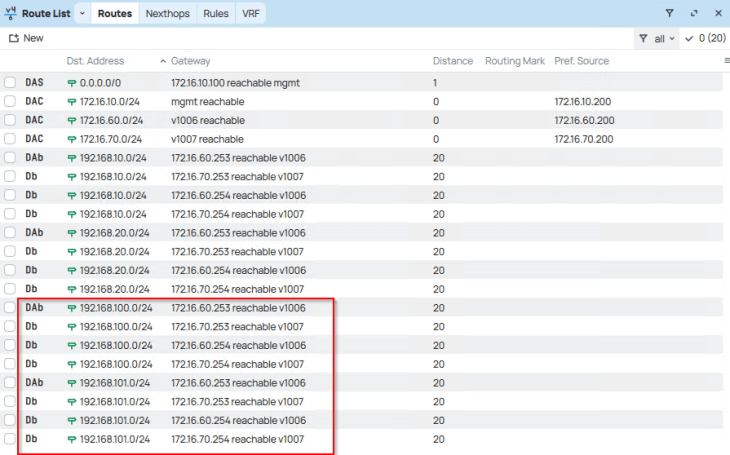 and finally, checking the routing table on the upstream physical fabrics, we see Ingress and Egress networks advertised from the T0 gateway. Because we enabled route aggregation on the T0 gateway to advertise only the summary route, we won’t see the more specific host routes (/32) in the physical fabrics, but just the summary route (/24).
