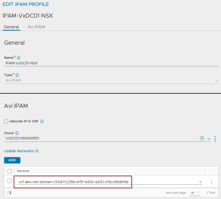 If we review the IPAM profile attached to the NSX cloud connector, we see that the VIP network has been added under usable networks.