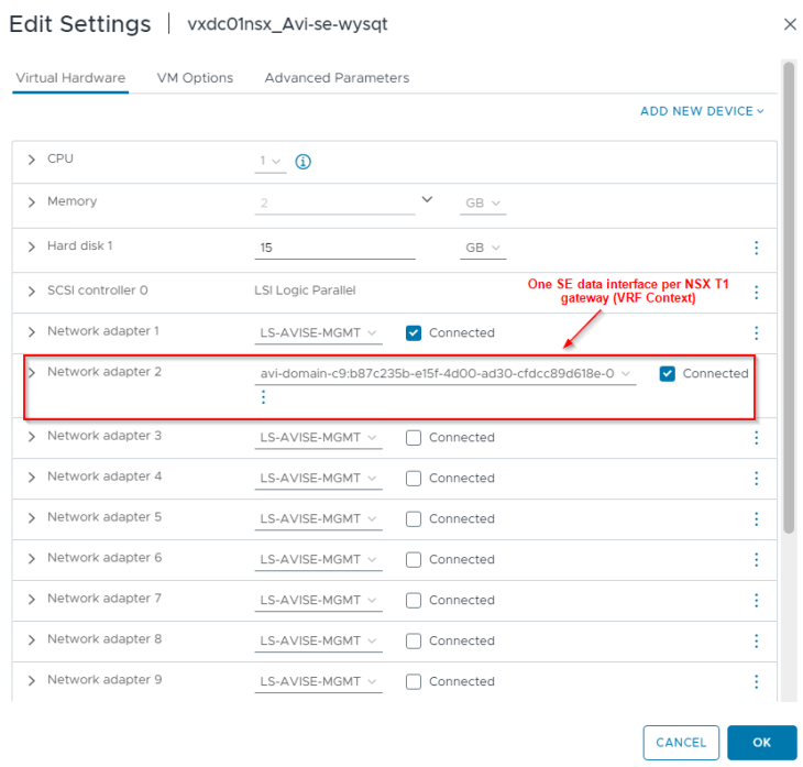 - AVI data network – As discussed previously, AVI SEs will work in a single arm mode under the NSX cloud connector. One SE interface will be consumed for each T1 gateway in the cloud connector and this interface will attach to the respective data network under the T1 gateway. DHCP is enabled on this data network (through segment DHCP in NSX)