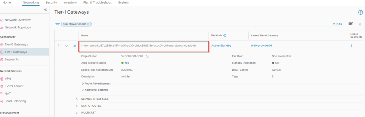 • TKG Service cluster network: This is where TKG service clusters attach to. One segment will be created for each TKG service cluster. This network is carved out from the namespace network (10.245.0.0/16) specified in the vSphere namespace creation workflow. Note that for this article, we haven’t deployed any TKG service clusters as we don’t have any networking changes to highlight.