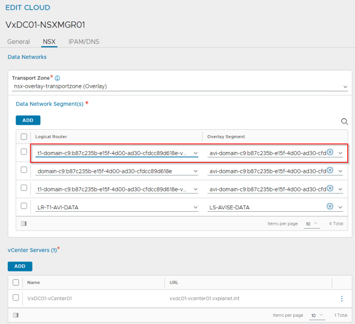 • AVI data network: This is where the AVI SE data interface for this vSphere namespace attach to. DHCP is enabled on this data network (through segment DHCP in NSX)