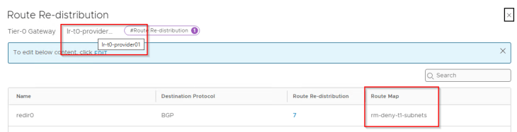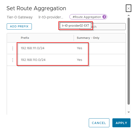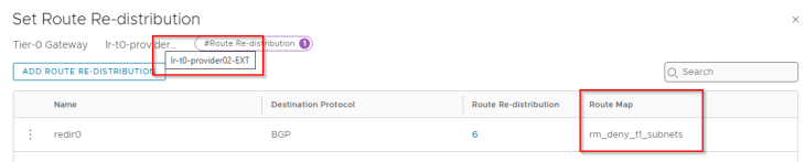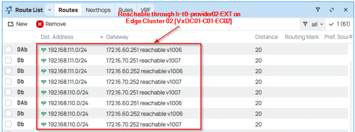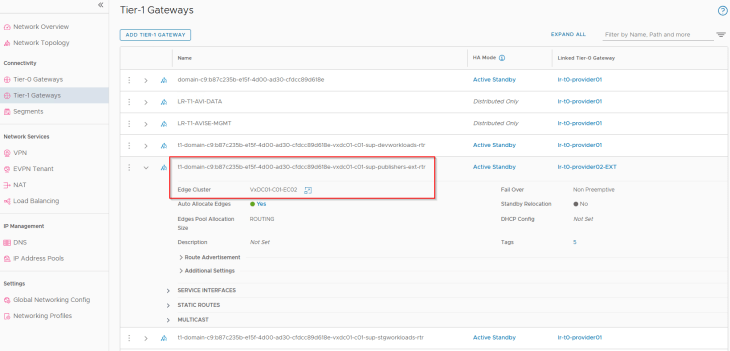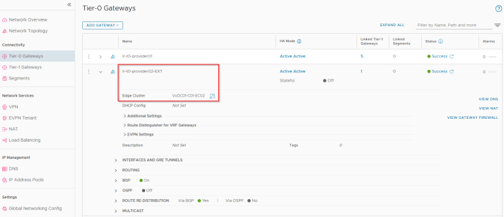We have a new T0 gateway “lr-t0-provider02-EXT” created on a new edge cluster “VxDC01-C01-EC02” that will be used for a fictitious publishing environment. This T0 gateway has BGP peering with dedicated upstream appliances to perform application publishing to a partner organization over a different routing path, just an use case.