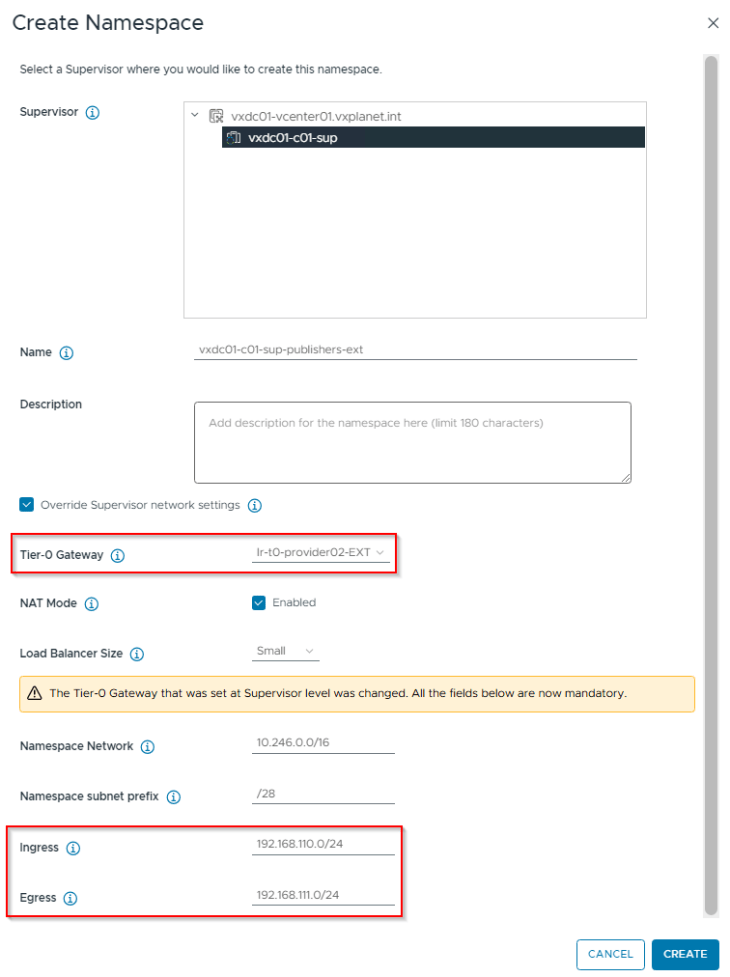 In this vSphere namespace topology, we will override all the network settings from the vSphere supervisor, because overriding the T0 gateway at the namespace level will require unique values for namespace network, ingress and egress CIDRs.