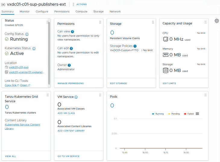 After basic namespace configuration (permissions, storage class, VM Class assignments etc,) we should have the vSphere namespace up and running.
