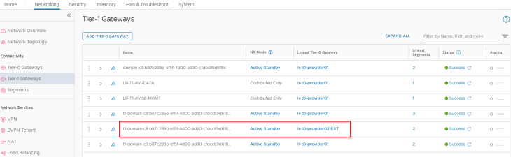 As discussed in Part 1 – Architecture and Topologies, a dedicated T1 gateway is created for the vSphere namespace, however this T1 gateway is up streamed to the custom T0 gateway “lr-t0-provider02-EXT “ that was specified during the namespace creation workflow.