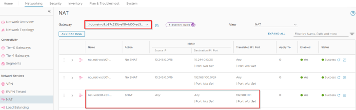 Since we have created the vSphere namespace with NAT mode enabled, we have an SNAT rule created under the namespace T1 gateway for outbound communication. This SNAT IP is taken from the Egress CIDR that we specified during the namespace creation workflow. Note that east-west communication between supervisor and vSphere namespaces will always happen with No-SNAT (We should see no-SNAT rules under the T1 gateways of supervisor and vSphere namespaces).