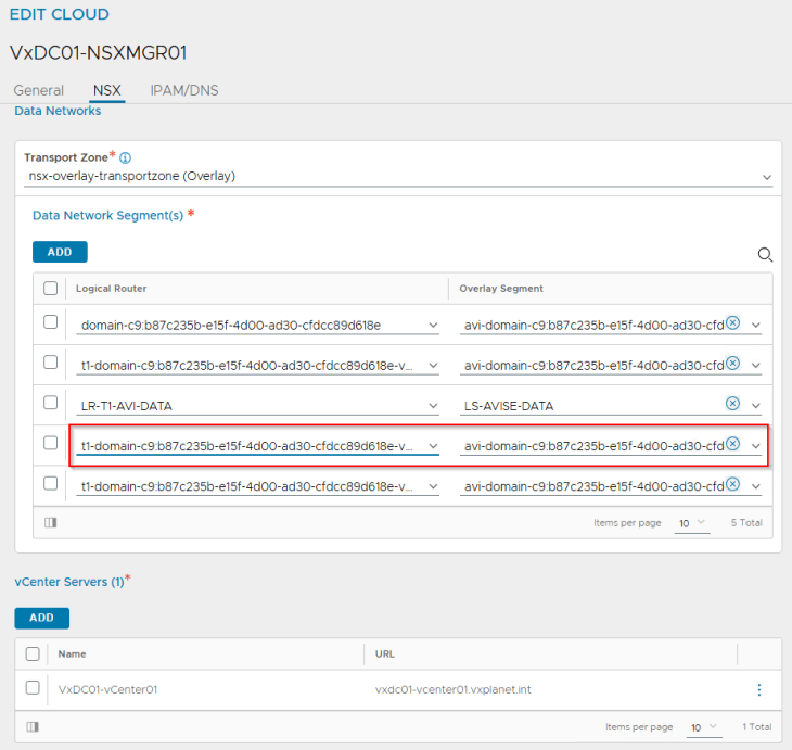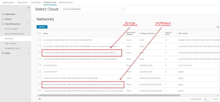 The dedicated T1 gateway created for the vSphere namespace and the respective AVI data segment will be added by the workflow as data networks to the AVI cloud connector.