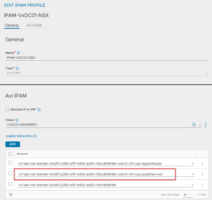 - VIP network: Because we are overriding the network settings from the supervisor with a custom Ingress network, we should see a new IPAM network created and added to the NSX cloud connector.