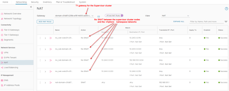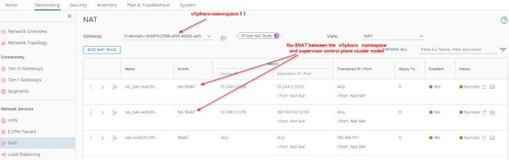 - vSphere supervisor is in no-NAT mode and vSphere namespace is in NAT mode