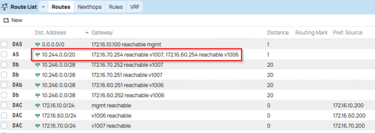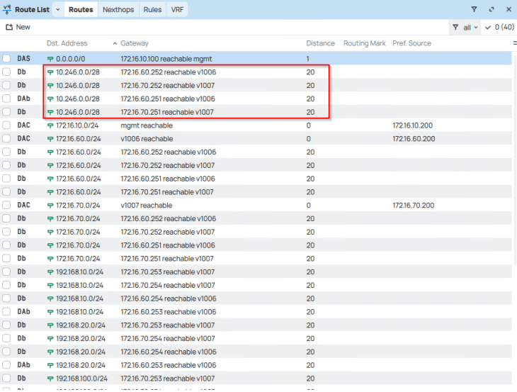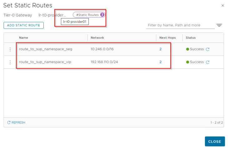 And below are the static routes configured on the namespace T0 gateway to reach the supervisor network and VIP network on the supervisor T0 gateway.